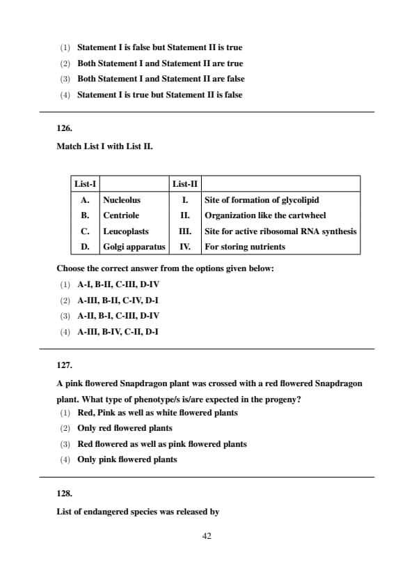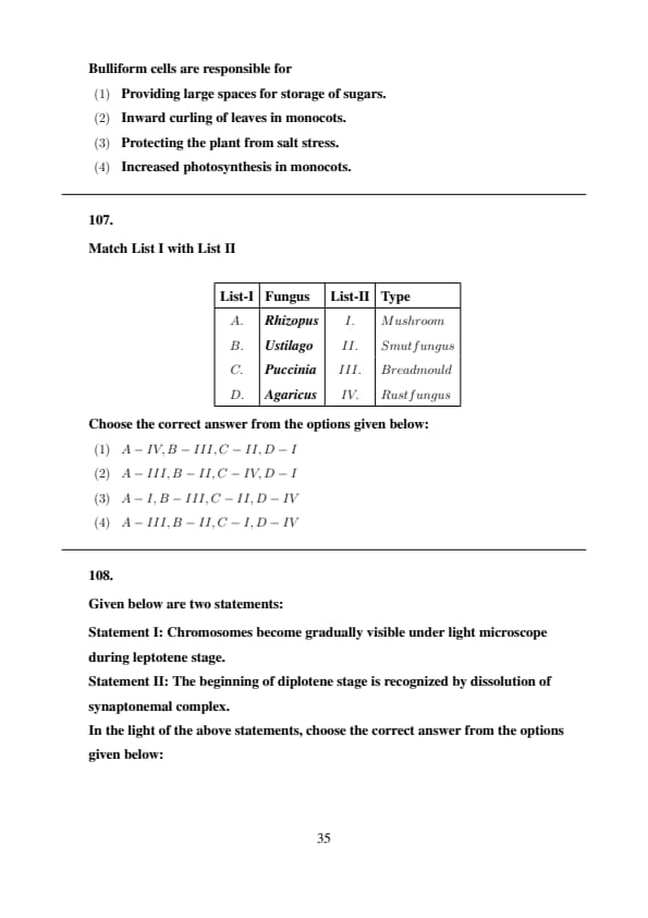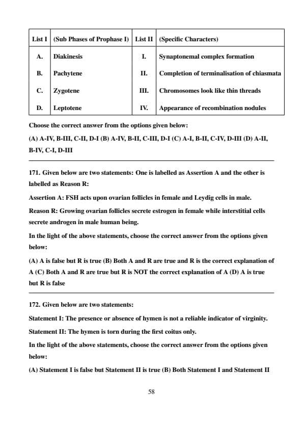 List I & (Sub Phases of Prophase I) & List II & (Specific Characters)