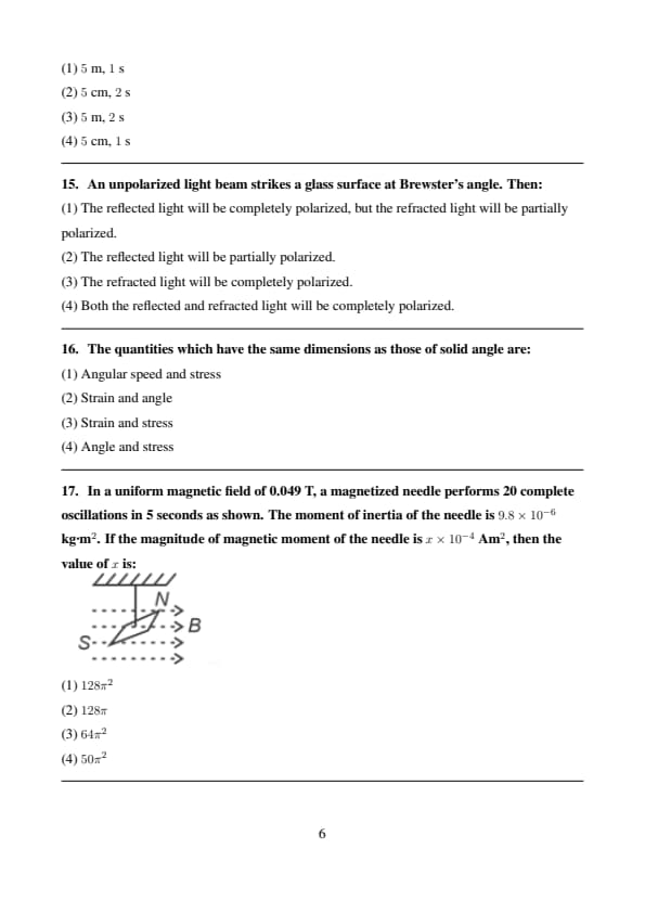 In a uniform magnetic field of 0.049 T, a magnetized needle performs 20 complete oscillations in 5 seconds as shown. The moment of inertia of the needle is \( 9.8 \times 10^{-6} \) kg·m\(^2\). If the magnitude of magnetic moment of the needle is \( x \times 10^{-4} \) Am\(^2\), then the value of \( x \) is: