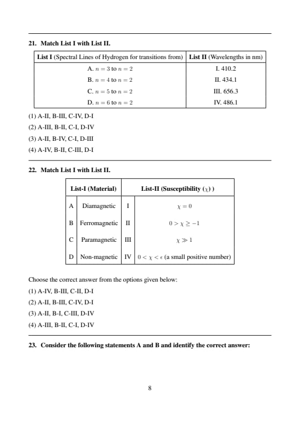 List I (Spectral Lines of Hydrogen for transitions from) & List II (Wavelengths in nm)