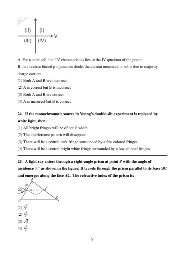 A light ray enters through a right-angle prism at point P with the angle of incidence \( 30^\circ \) as shown in the figure. It travels through the prism parallel to its base BC and emerges along the face AC. The refractive index of the prism is: