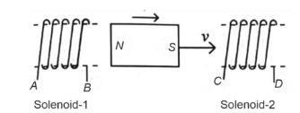 In the above diagram, a strong bar magnet is moving towards solenoid-2 from solenoid-1. The direction of induced current in solenoid-1 and that in solenoid-2, respectively, are through the directions: