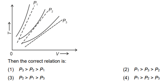 The following graph represents the \(T-V\) curves of an ideal gas (where \(T\) is the temperature and \(V\) the volume) at three pressures \(P_1\), \(P_2\) and \(P_3\) compared with those of Charles's law represented as dotted lines.