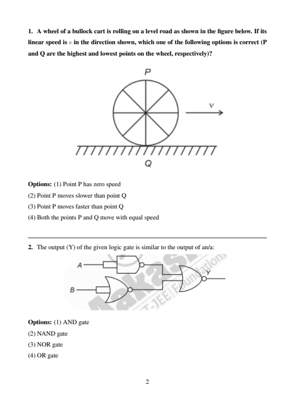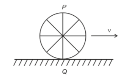 A wheel of a bullock cart is rolling on a level road as shown in the figure below. If its linear speed is \(v\) in the direction shown, which one of the following options is correct (P and Q are the highest and lowest points on the wheel, respectively)?