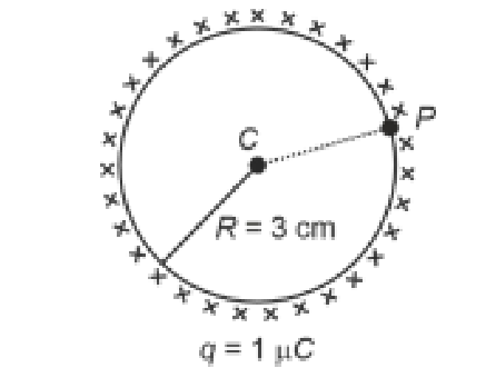 A thin spherical shell is charged by some source. The potential difference between the two points C and P (in V) shown in the figure is: