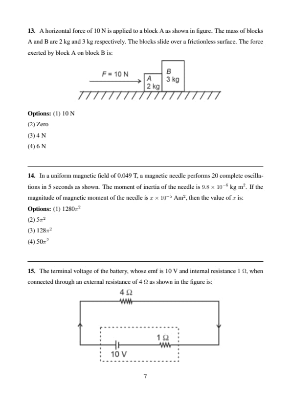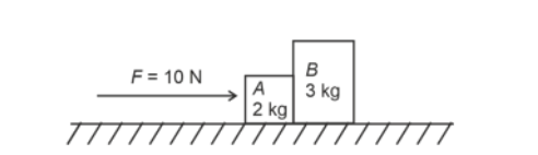 A horizontal force of 10 N is applied to a block A as shown in figure. The mass of blocks A and B are 2 kg and 3 kg respectively. The blocks slide over a frictionless surface. The force exerted by block A on block B is: