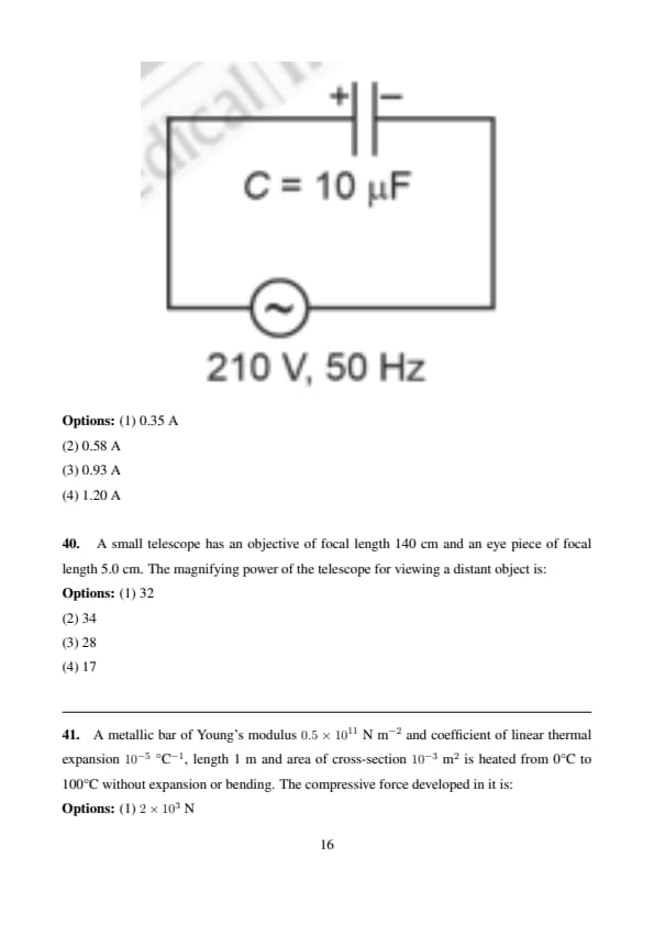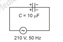 A 10 \(\mu\)F capacitor is connected to a 210 V, 50 Hz source as shown in the figure. The peak current in the circuit is nearly (take \(\pi = 3.14\)):