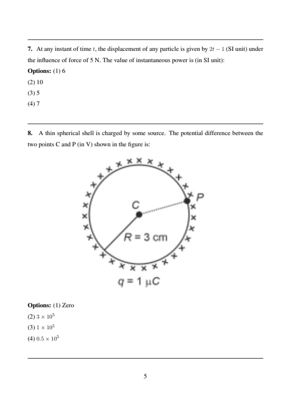 At any instant of time \(t\), the displacement of any particle is given by \(2t - 1\) (SI unit) under the influence of force of 5 N. The value of instantaneous power is (in SI unit):