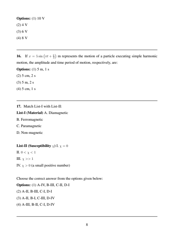 If \(x = 5 \sin \left( \pi t + \frac{\pi}{3} \right)\) m represents the motion of a particle executing simple harmonic motion, the amplitude and time period of motion, respectively, are:
