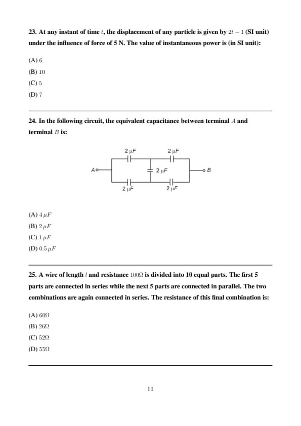 At any instant of time \( t \), the displacement of any particle is given by \( 2t - 1 \) (SI unit) under the influence of force of 5 N. The value of instantaneous power is (in SI unit):
