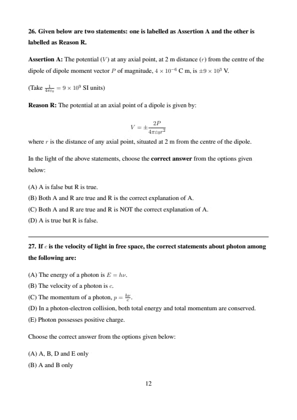 Assertion A: The potential (\(V\)) at any axial point, at 2 m distance (\(r\)) from the centre of the dipole of dipole moment vector \( P \) of magnitude, \( 4 \times 10^{-6} \) C m, is \( \pm 9 \times 10^3 \) V.