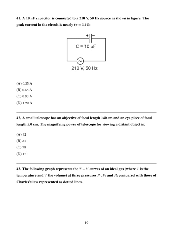 A 10 \(\mu\)F capacitor is connected to a 210 V, 50 Hz source as shown in figure. The peak current in the circuit is nearly (\(\pi = 3.14\)):