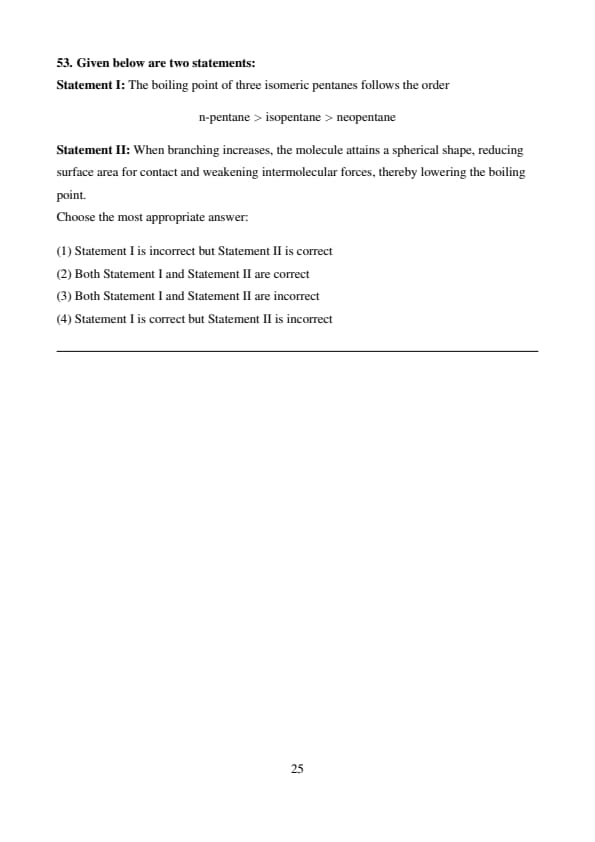 Statement I: The boiling point of three isomeric pentanes follows the order \[ n-pentane > isopentane > neopentane \]