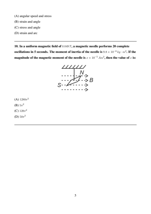 In a uniform magnetic field of \(0.049 \, T\), a magnetic needle performs 20 complete oscillations in 5 seconds. The moment of inertia of the needle is \( 9.8 \times 10^{-6} \, kg \cdot m^2 \). If the magnitude of the magnetic moment of the needle is \( x \times 10^{-5} \, Am^2 \), then the value of \( x \) is:
