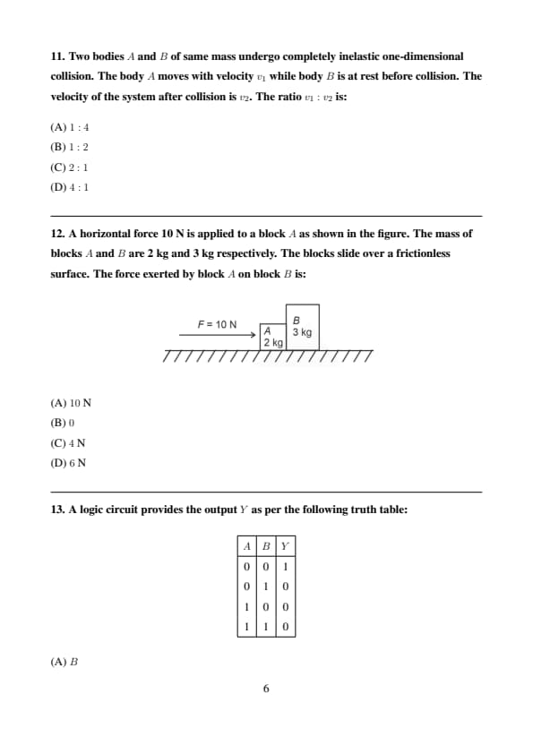 A horizontal force 10 N is applied to a block \( A \) as shown in the figure. The mass of blocks \( A \) and \( B \) are 2 kg and 3 kg respectively. The blocks slide over a frictionless surface. The force exerted by block \( A \) on block \( B \) is: