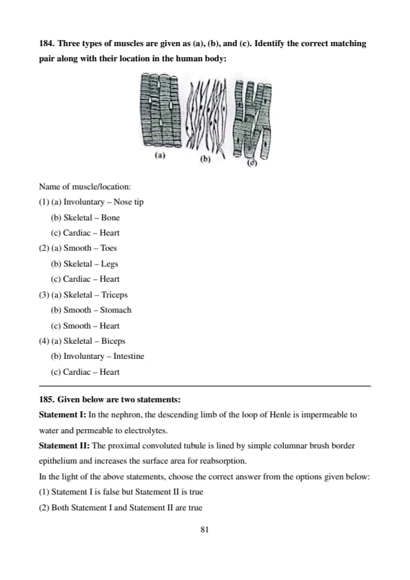 Three types of muscles are given as (a), (b), and (c). Identify the correct matching pair along with their location in the human body: