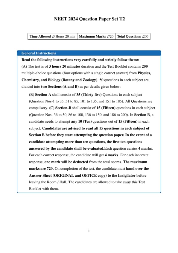 NEET 2024 Question paper with answer key pdf T2 is available for download. NEET 2024 T2 question paper has been conducted by the NTA on May 5, 2024, in pen-paper mode. NEET 2024 question paper code T2 consists of 200 MCQs- 180 to be attempted in 200 minutes. Each of the 4 subjects (Zoology, Botany, Chemistry, Physics) in NEET T2 question paper 2023 have 50 MCQs (45 to be attempted). You can download NEET 2024 question paper with answer key with solutions PDF for T2 using the links given below. Check NEET Cutoff