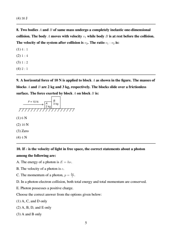 A horizontal force 10 N is applied to a block A as shown in the figure. The mass of blocks A and B are 2 kg and 3 kg respectively. The blocks slide over a frictionless surface. The force exerted by block A on block B is: