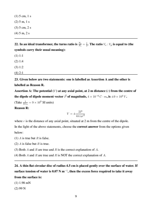 Assertion A: The potential (V) at any axial point, at 2 m distance (r) from the centre of the dipole of dipole moment vector P of magnitude, 4 × 10-6 C·m, is ±9 × 10³ V. (1⁄4πε₀ = 9 × 10⁹ SI units)