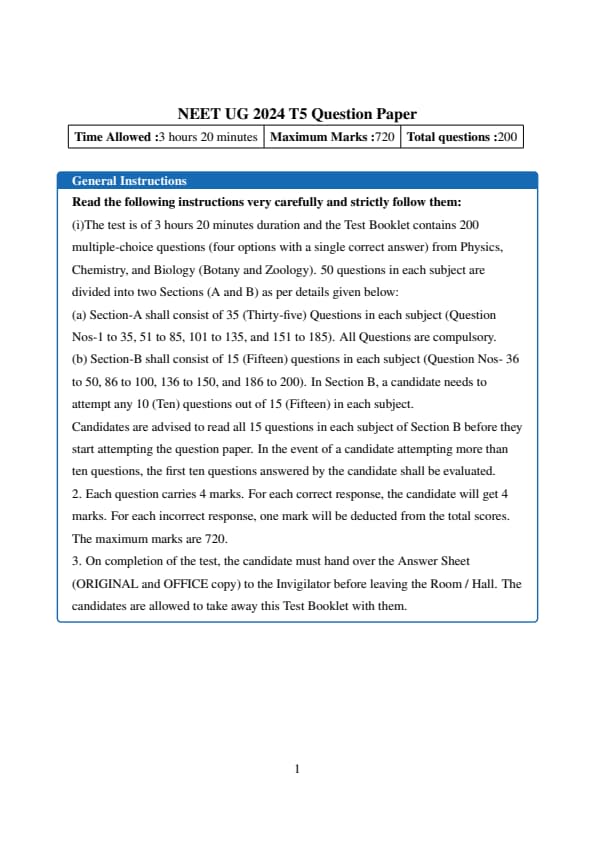 NEET 2024 Question paper with answer key pdf T5 is available for download. NEET 2024 T5 question paper has been conducted by the NTA on May 5, 2024, in pen-paper mode. NEET 2024 question paper code T5 consists of 200 MCQs- 180 to be attempted in 200 minutes. Each of the 4 subjects (Zoology, Botany, Chemistry, Physics) in NEET T5 question paper 2023 have 50 MCQs (45 to be attempted). You can download NEET 2024 question paper with answer key with solutions PDF for T5 using the links given below. Check NEET Cutoff