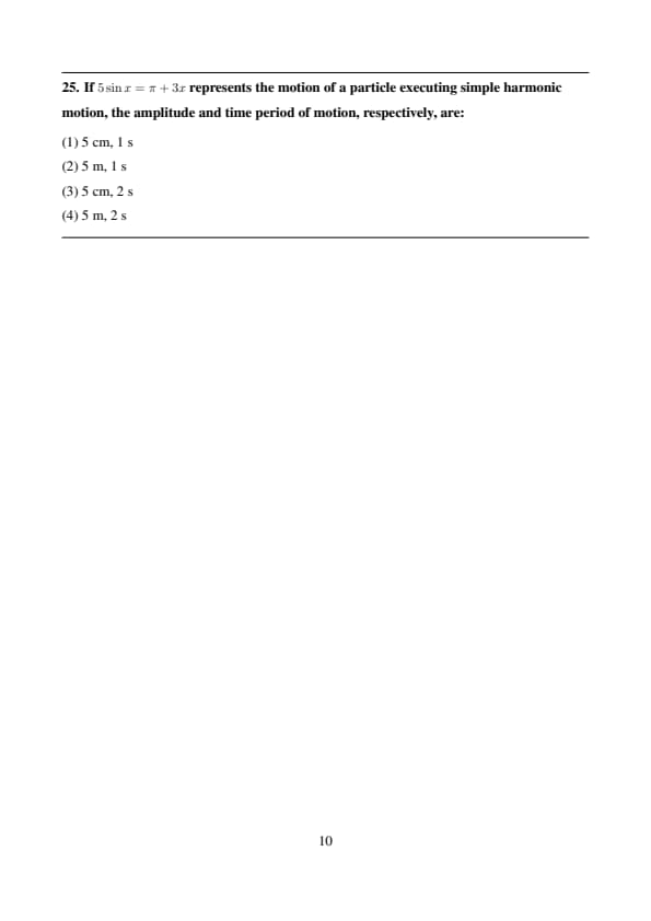 If \( 5 \sin x = \pi + 3x \) represents the motion of a particle executing simple harmonic motion, the amplitude and time period of motion, respectively, are: