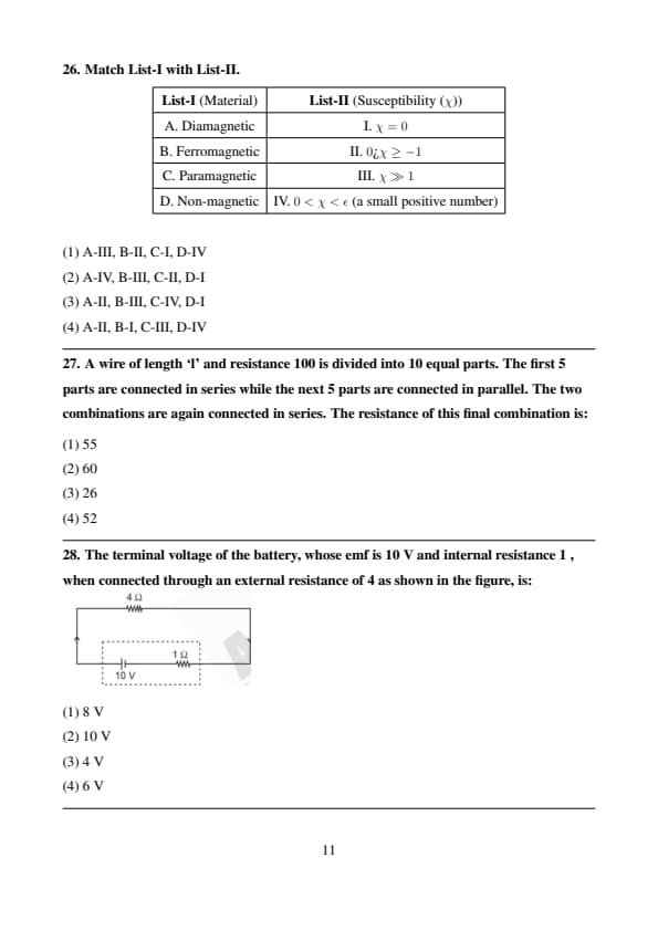 A wire of length ‘l’ and resistance 100 is divided into 10 equal parts. The first 5 parts are connected in series while the next 5 parts are connected in parallel. The two combinations are again connected in series. The resistance of this final combination is: