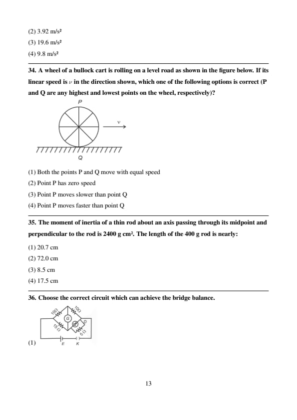 A wheel of a bullock cart is rolling on a level road as shown in the figure below. If its linear speed is \( \nu \) in the direction shown, which one of the following options is correct (P and Q are any highest and lowest points on the wheel, respectively)?