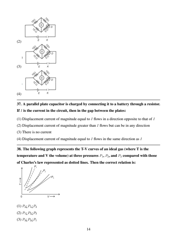 The following graph represents the T-V curves of an ideal gas (where T is the temperature and V the volume) at three pressures \( P_1 \), \( P_2 \), and \( P_3 \) compared with those of Charles’s law represented as dotted lines. Then the correct relation is: