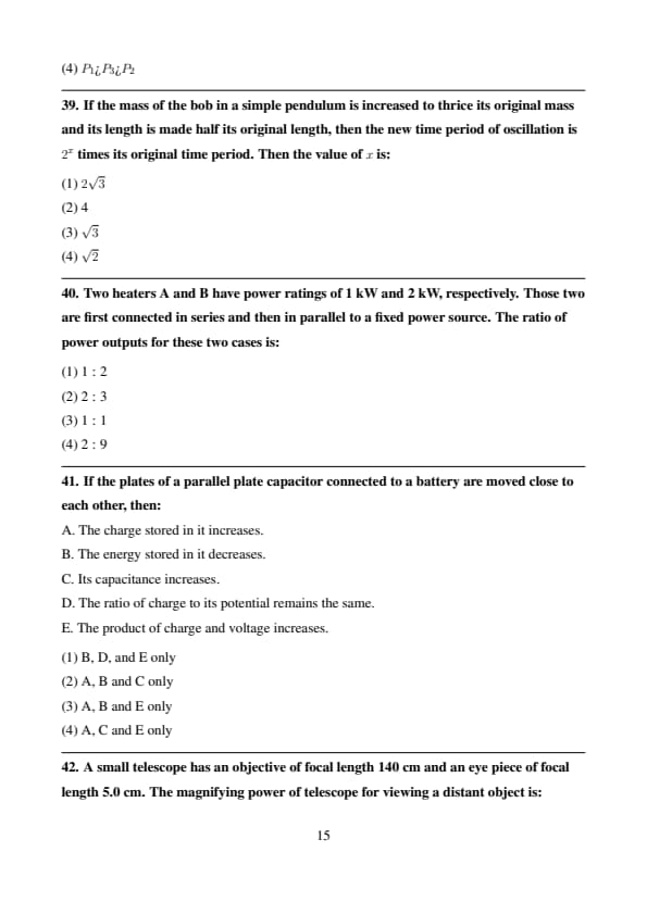 If the mass of the bob in a simple pendulum is increased to thrice its original mass and its length is made half its original length, then the new time period of oscillation is \( 2^x \) times its original time period. Then the value of \( x \) is: