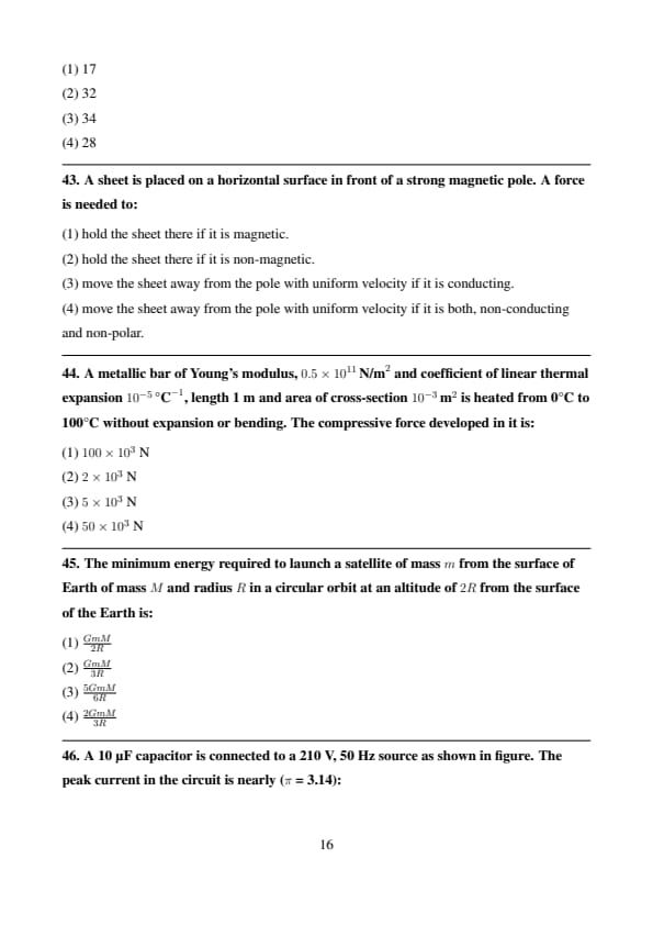 A metallic bar of Young’s modulus, \( 0.5 \times 10^{11} \, N/m^2 \) and coefficient of linear thermal expansion \( 10^{-5} \, °C^{-1} \), length 1 m and area of cross-section \( 10^{-3} \, m^2 \) is heated from 0°C to 100°C without expansion or bending. The compressive force developed in it is: