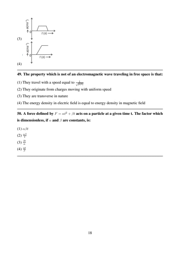 A force defined by \( F = \alpha t^2 + \beta t \) acts on a particle at a given time t. The factor which is dimensionless, if \( \alpha \) and \( \beta \) are constants, is: