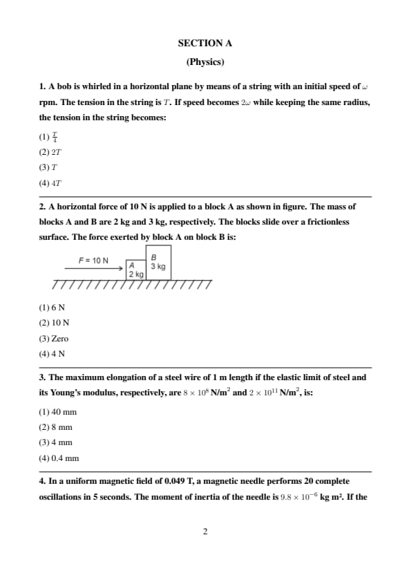 A bob is whirled in a horizontal plane by means of a string with an initial speed of \( \omega \) rpm. The tension in the string is \( T \). If speed becomes \( 2\omega \) while keeping the same radius, the tension in the string becomes: