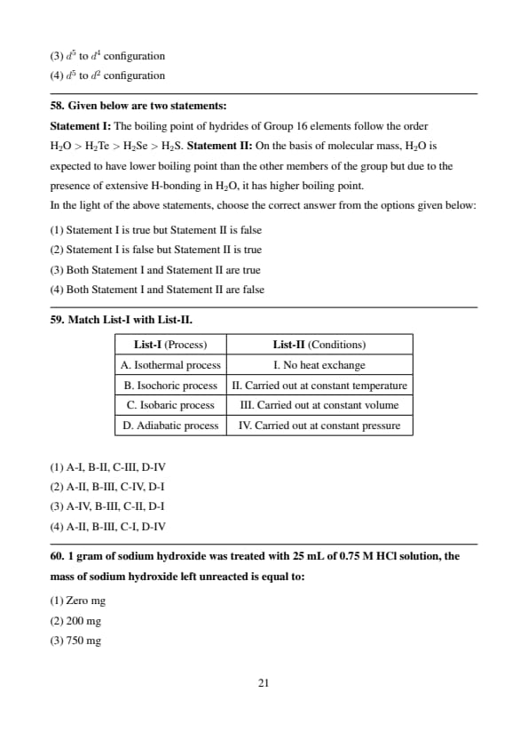 Statement II: On the basis of molecular mass, \( H_2O \) is expected to have lower boiling point than the other members of the group but due to the presence of extensive H-bonding in \( H_2O \), it has higher boiling point.