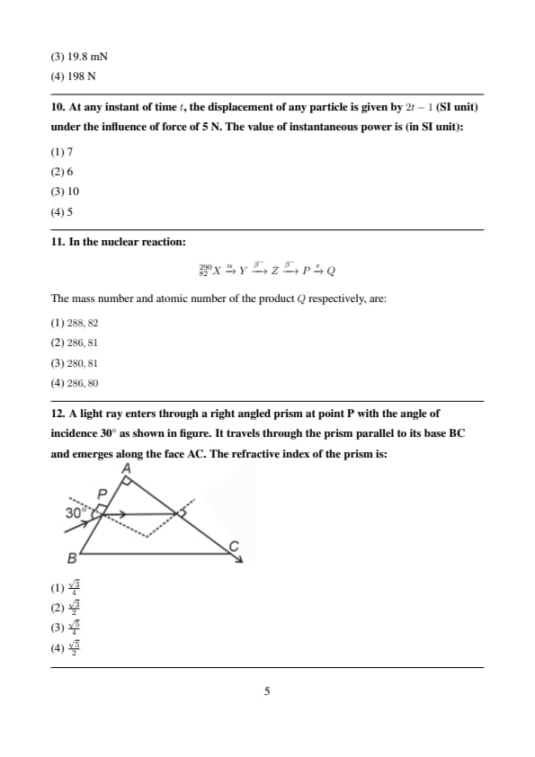 At any instant of time \( t \), the displacement of any particle is given by \( 2t - 1 \) (SI unit) under the influence of force of 5 N. The value of instantaneous power is (in SI unit):