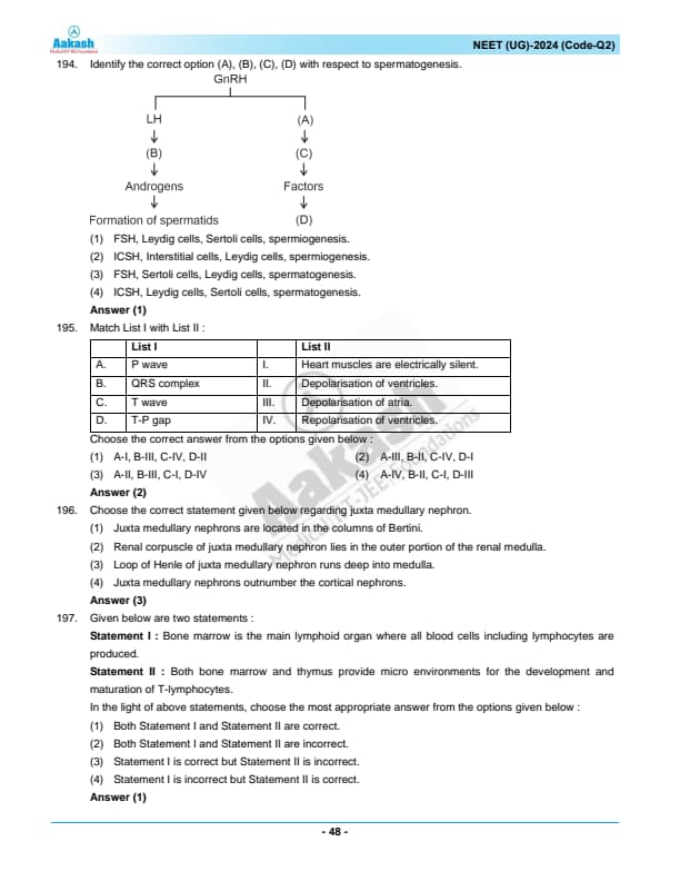 Statement II: Correct. The bone marrow produces T-lymphocytes, which mature in the thymus. Both organs provide the necessary environments for T-cell development. Quick Tip: Bone marrow is the site of hematopoiesis (blood cell production), while the thymus is responsible for the maturation of T-lymphocytes, essential for the adaptive immune response.