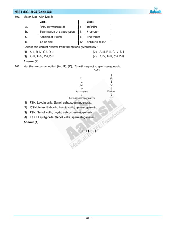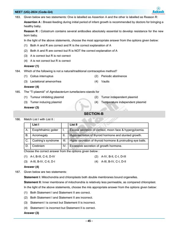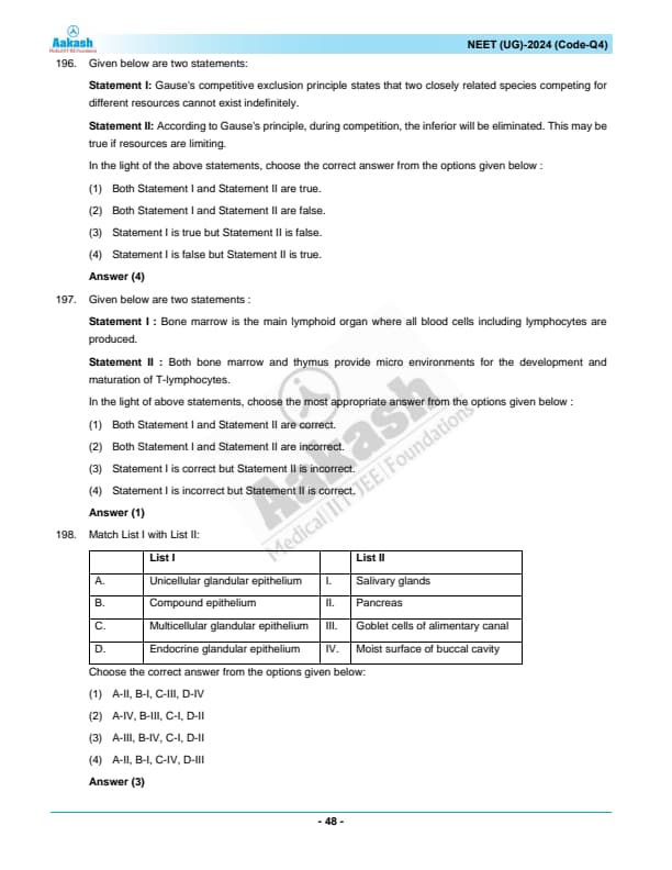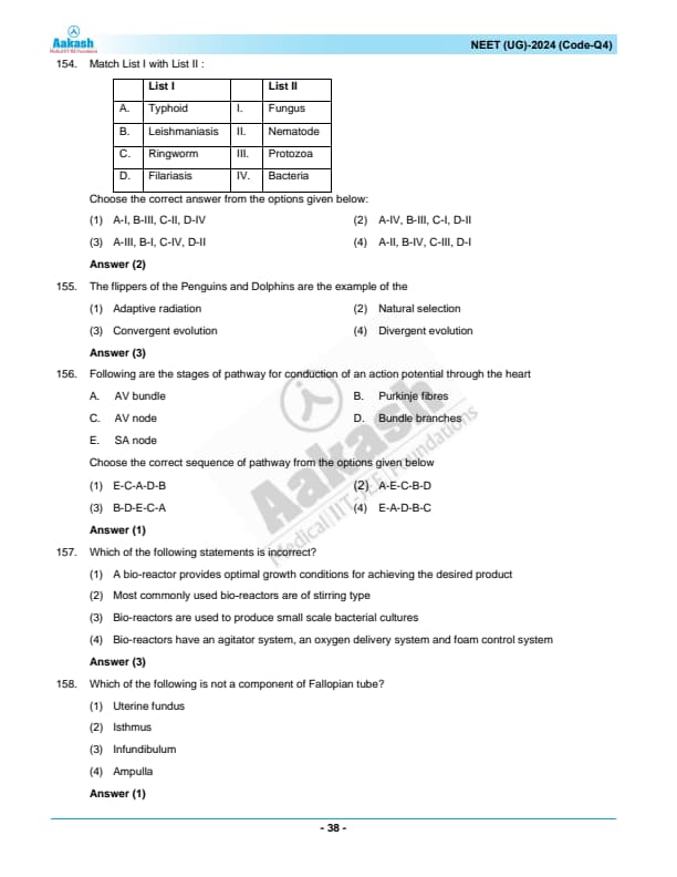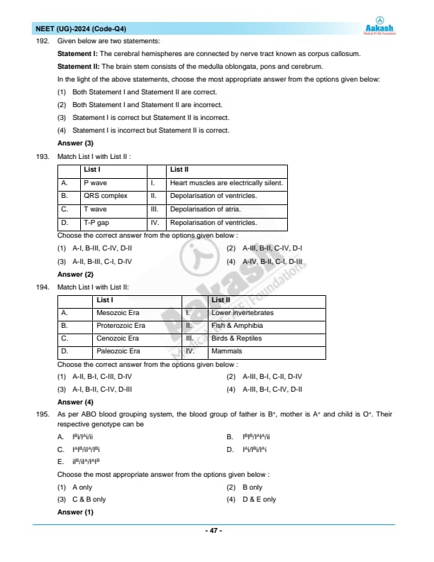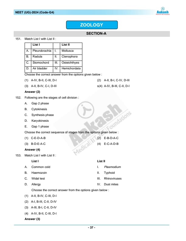 NEET 2024 Zoology Question Paper with Solutions PDF Q4 is available for download. NEET 2024 Q4 Zoology Question Paper comprises 50 MCQs out of which only 45 are to be attempted. NEET 2024 question Q4 Zoology is divided into 2 sections- A (35 questions) and B (15 questions). You can download NEET 2024 zoology question paper with answer key and solutions PDF for Q4 using the links given below.
