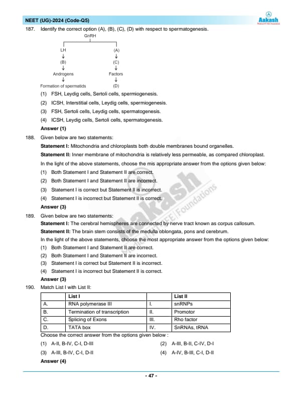 187. Identify the correct option (A), (B), (C), (D) with respect to spermatogenesis: