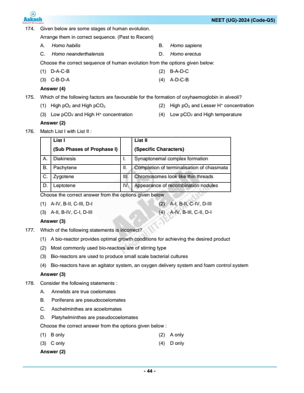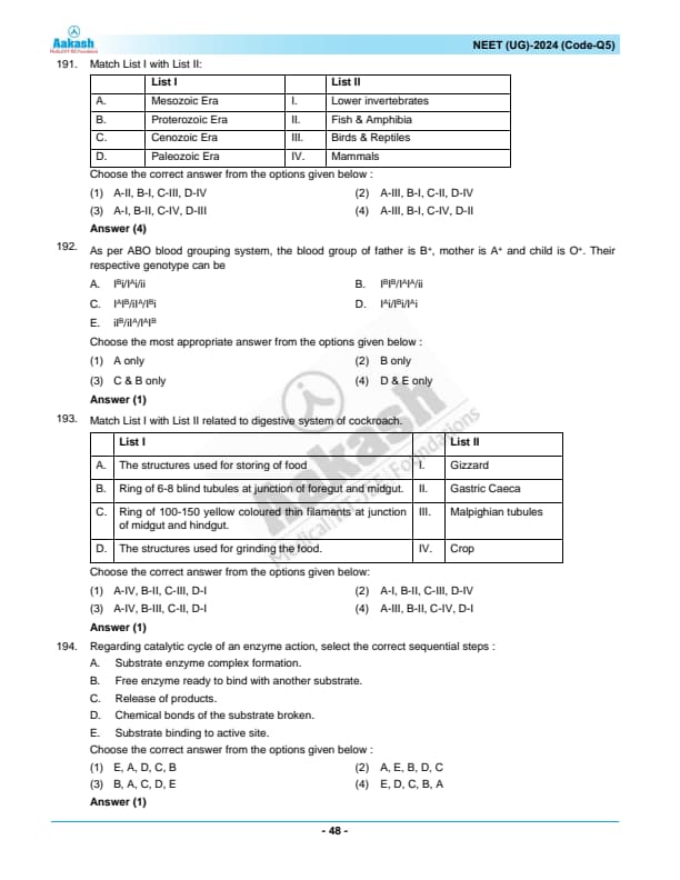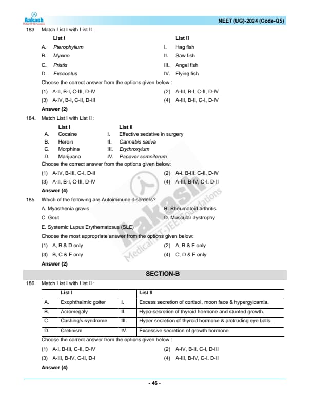 NEET 2024 Zoology Question Paper with Solutions PDF Q5 is available for download. NEET 2024 Q5 Zoology Question Paper comprises 50 MCQs out of which only 45 are to be attempted. NEET 2024 question Q5 Zoology is divided into 2 sections- A (35 questions) and B (15 questions). You can download NEET 2024 zoology question paper with answer key and solutions PDF for Q5 using the links given below. [PDF Source: aakash.ac.in]