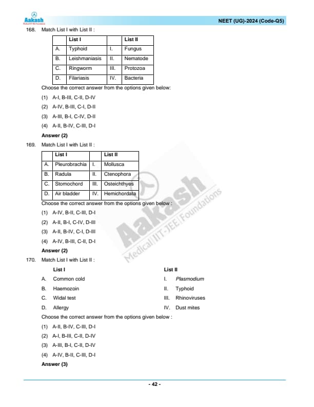 170. Match List I with List II: