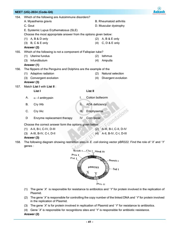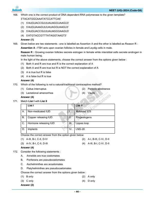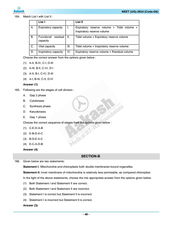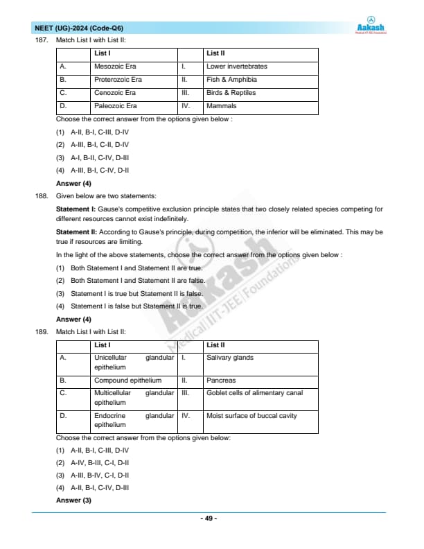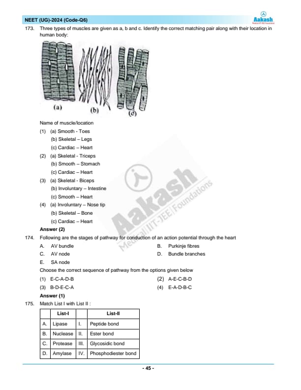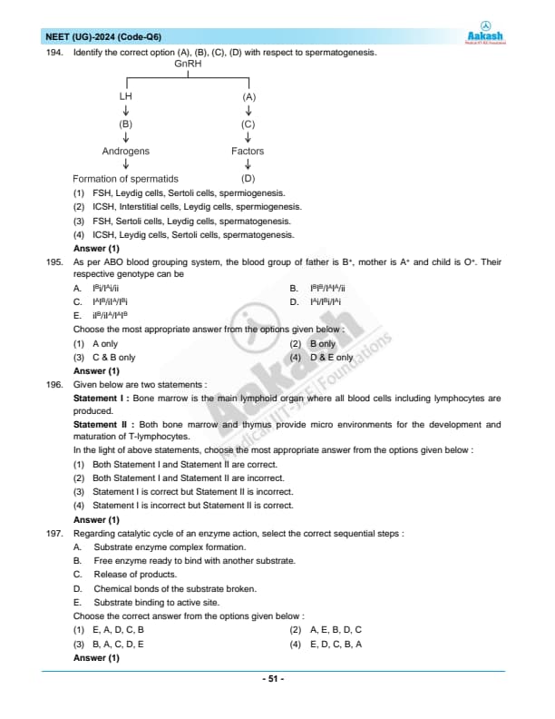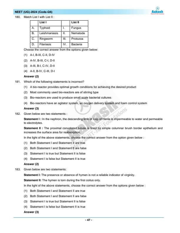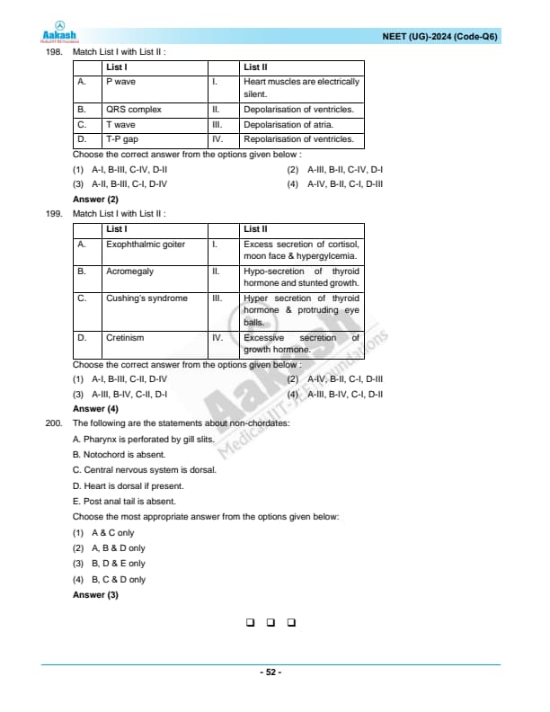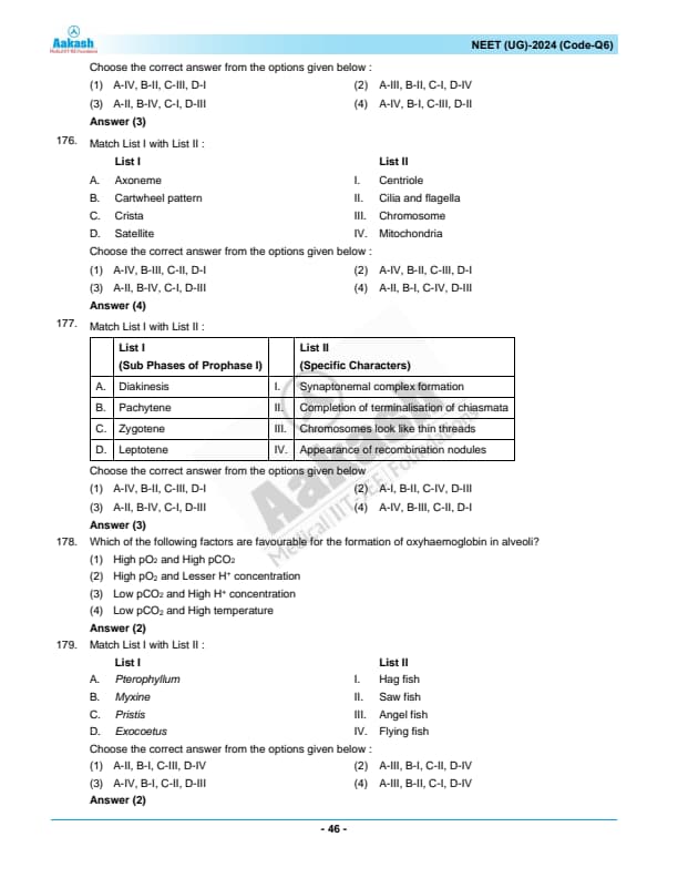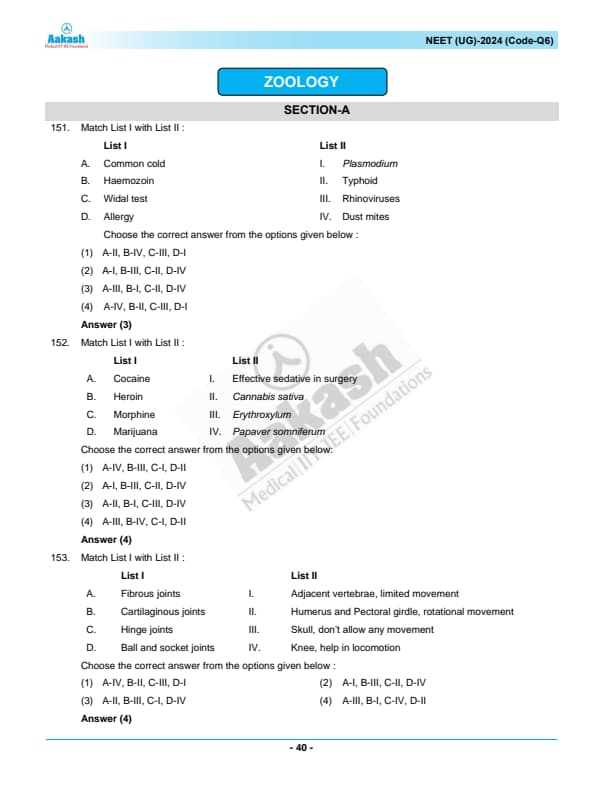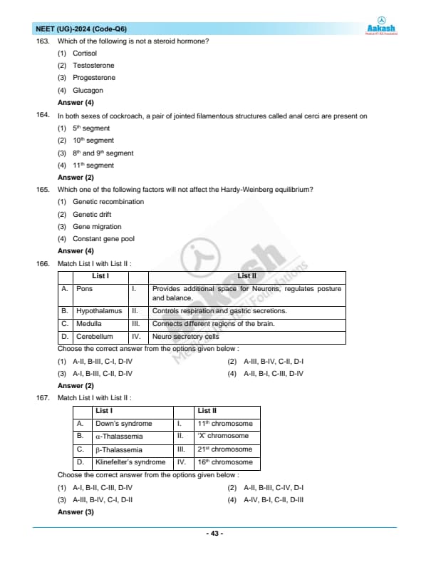 NEET 2024 Zoology Question Paper with Solutions PDF Q6 is available for download. NEET 2024 Q6 Zoology Question Paper comprises 50 MCQs out of which only 45 are to be attempted. NEET 2024 question Q6 Zoology is divided into 2 sections- A (35 questions) and B (15 questions). You can download NEET 2024 zoology question paper with answer key and solutions PDF for Q6 using the links given below. [PDF Source: aakash.ac.in]