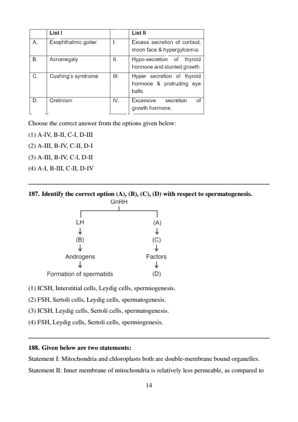 (3) A-III, B-IV, C-I, D-II. Quick Tip: Endocrine disorders like Cushing’s syndrome and acromegaly are caused by excessive hormone secretion, while cretinism is due to undersecretion of thyroid hormone.