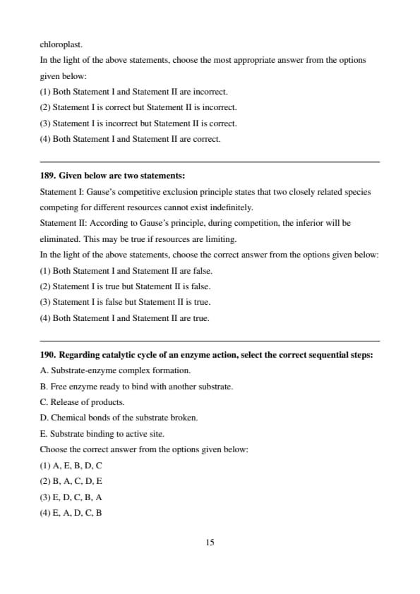 (3) Statement I is false but Statement II is true. Quick Tip: Gause's competitive exclusion principle emphasizes that species competing for the same resources cannot coexist for long if resources are limiting.