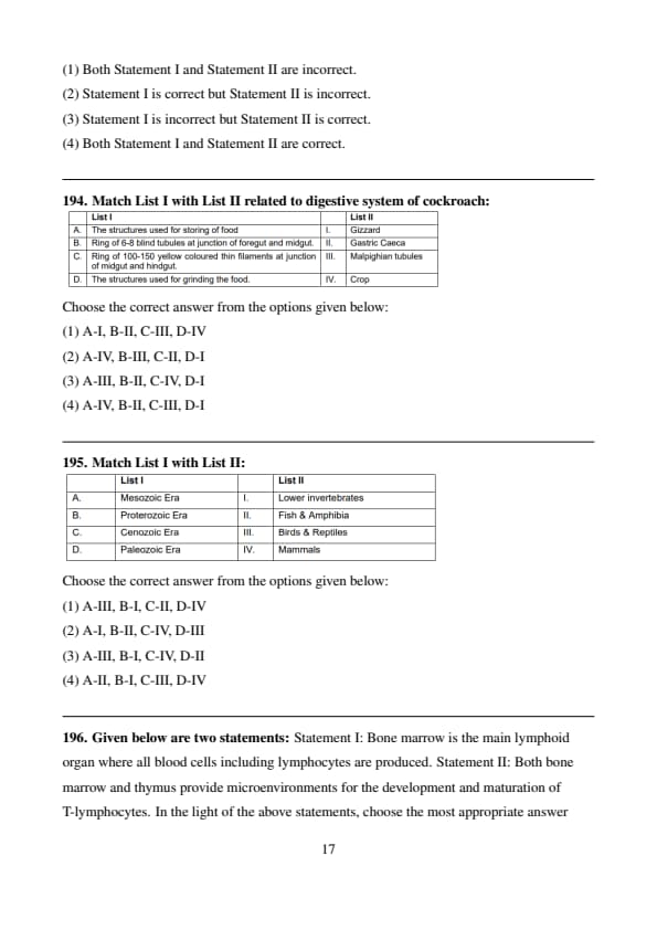 (4) Both Statement I and Statement II are correct. Quick Tip: The bone marrow produces blood cells, including lymphocytes, while the thymus is key for T-lymphocyte maturation.