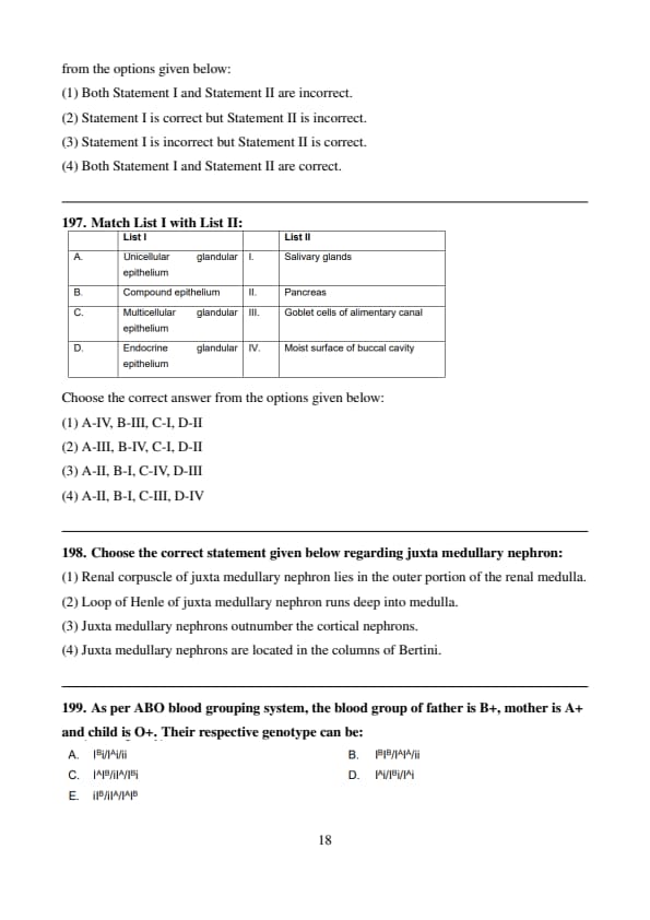 - Statement 1 is incorrect because the renal corpuscle of juxta medullary nephrons lies in the cortex, not the outer portion of the renal medulla.