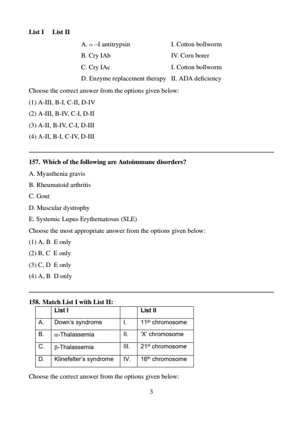 Thus, the correct answer is (1) A, B & E only. Quick Tip: Autoimmune diseases involve the immune system mistakenly attacking the body’s own cells, leading to conditions like rheumatoid arthritis and SLE.