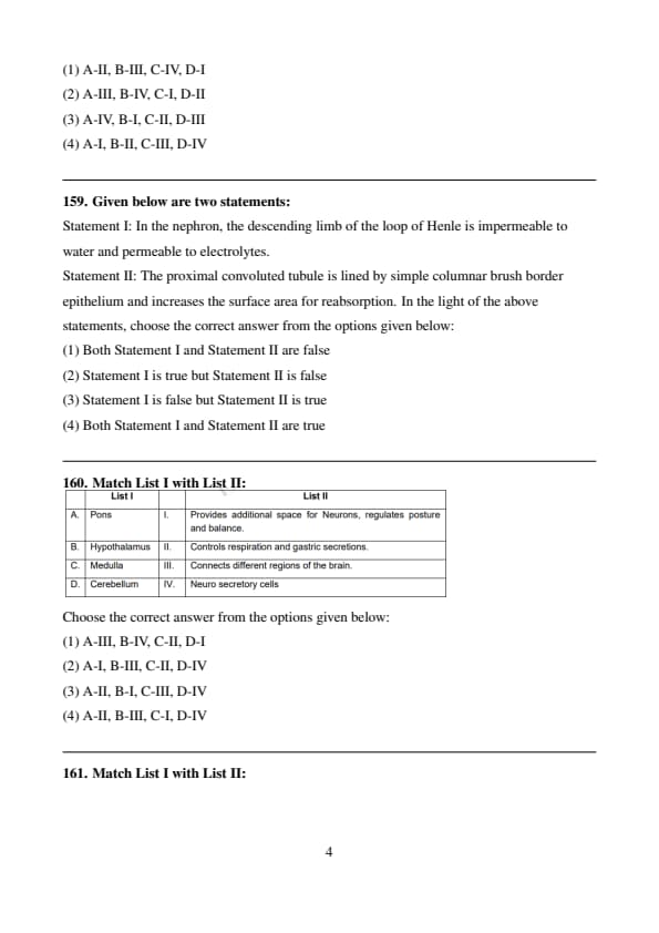 Thus, the correct answer is (1) A-III, B-IV, C-II, D-I. Quick Tip: The pons is involved in connecting brain regions, the hypothalamus controls hormone secretion, the medulla regulates vital functions, and the cerebellum coordinates movement and balance.