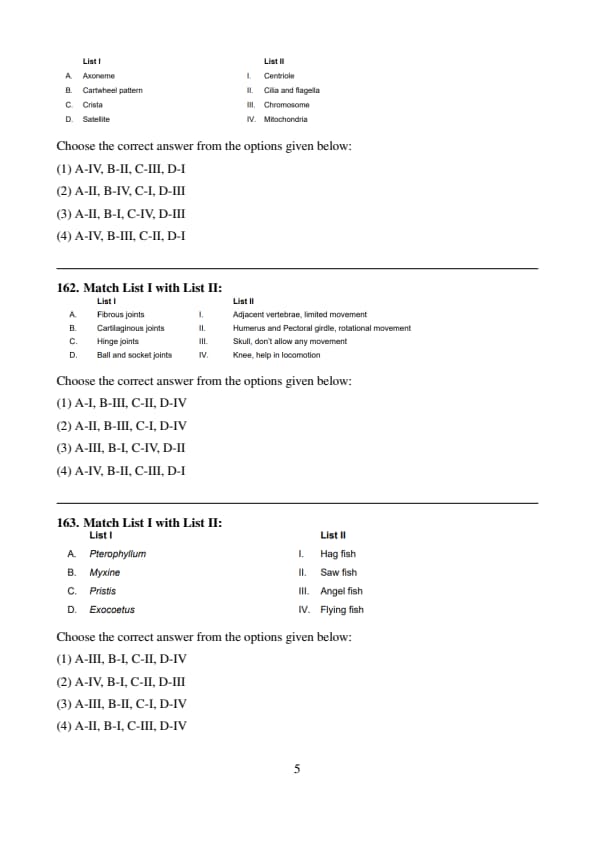 (3) A-III, B-I, C-IV, D-II. Quick Tip: Fibrous joints are immovable, cartilaginous joints allow limited movement, hinge joints allow bending, and ball-and-socket joints allow rotational movement.