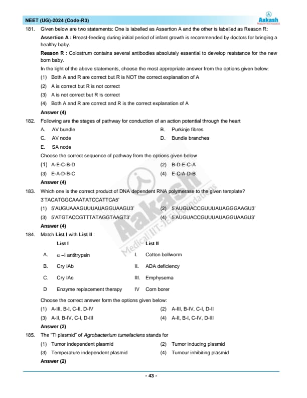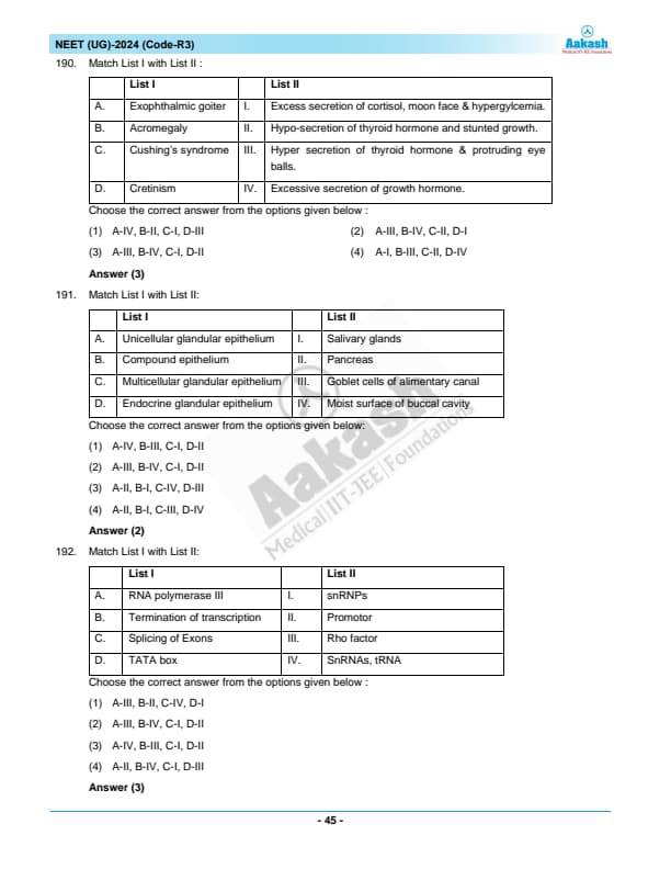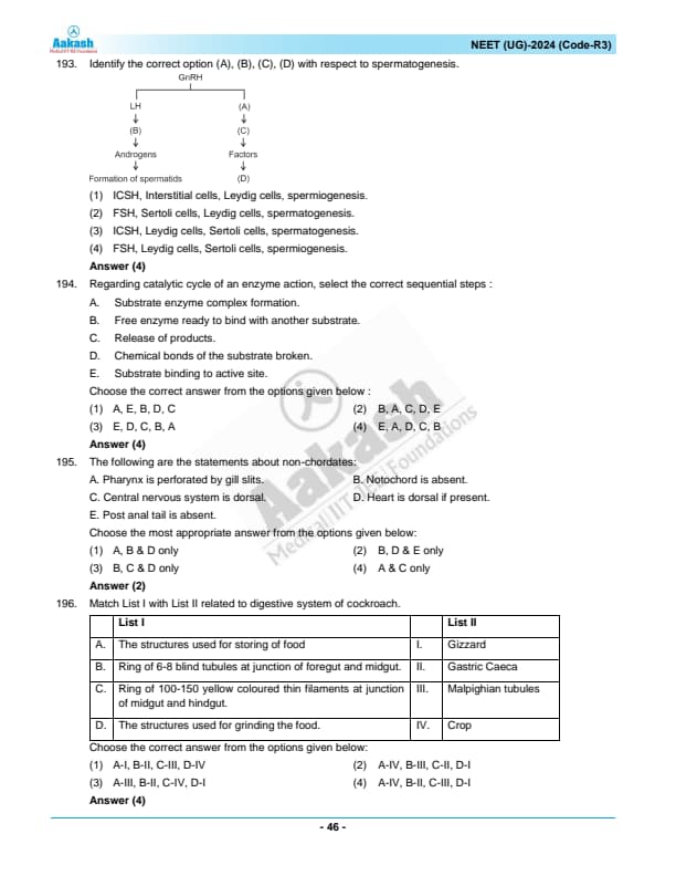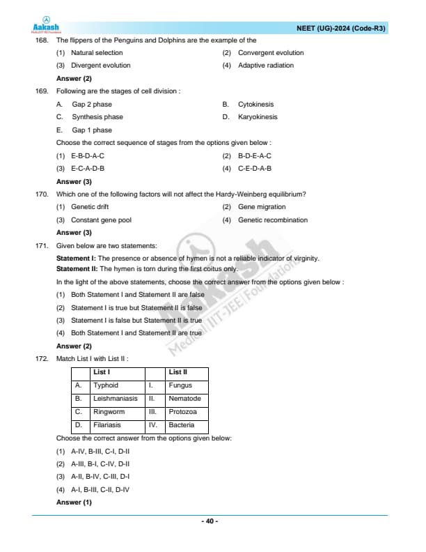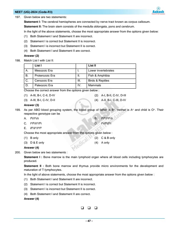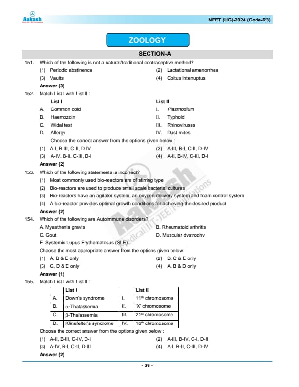 NEET 2024 Zoology Question Paper with Solutions PDF R3 is available for download. NEET 2024 R3 Zoology Question Paper comprises 50 MCQs out of which only 45 are to be attempted. NEET 2024 question R3 Zoology is divided into 2 sections- A (35 questions) and B (15 questions). You can download NEET 2024 zoology question paper with answer key and solutions PDF for R3 using the links given below. [PDF Source: aakash.ac.in]