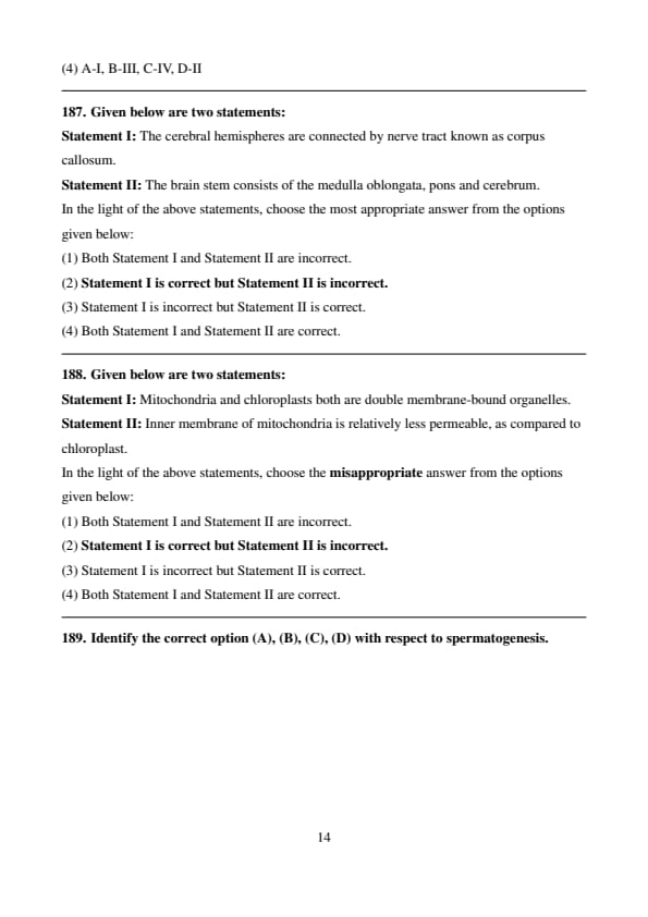 - Since both Statement I and Statement II are incorrect, the correct answer is Option (1). Quick Tip: - The descending limb of Henle’s loop is permeable to water and impermeable to electrolytes, allowing water reabsorption. - The proximal convoluted tubule (PCT) is lined by simple cuboidal epithelium with a brush border, increasing reabsorption efficiency.