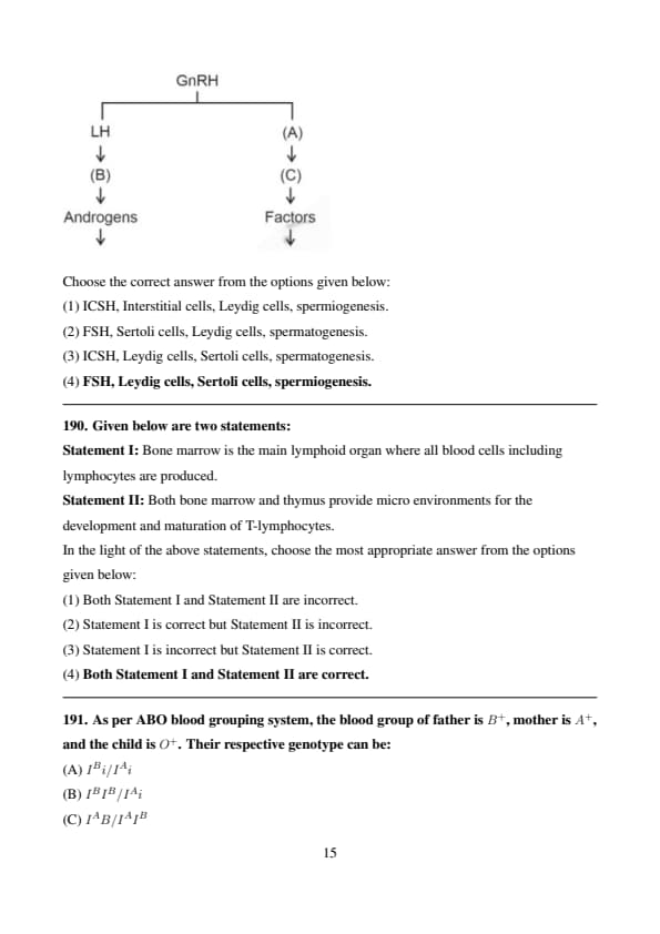 - Since Assertion A is false and Reason R is true, the correct answer is Option (3) A is false but R is true. Quick Tip: - FSH stimulates ovarian follicles in females and Sertoli cells in males (not Leydig cells). - LH stimulates Leydig cells to produce testosterone. - Ovarian follicles secrete estrogen, while Leydig cells secrete androgens in males.
