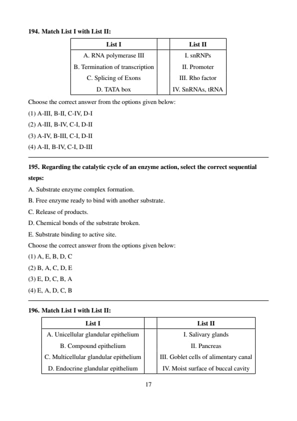 Conclusion: The correct answer is (3) A-IV, B-III, C-I, D-II. Quick Tip: RNA polymerase III transcribes small RNAs like tRNA. The Rho factor is essential in terminating transcription. The TATA box is a promoter sequence that plays a crucial role in transcription initiation.